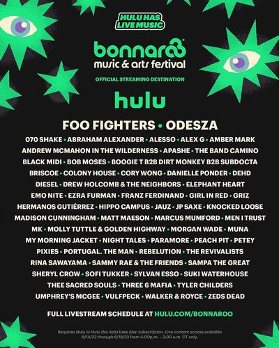 In June 2023 we brought this iconic festival to Hulu, reflecting the diversity of Bonnaroo's lineup in two carefully curated channels of music with acts from across five different stages. Viewers were kept entertained all weekend long with performances by Paramore, Foo Fighters, ODESZA, Tyler Childers, Suki Waterhouse, Korn, and more. From rising stars to headliners, we made sure that the energy and passion behind each performance was captured, giving viewers at home the true Bonnaroovian experience.