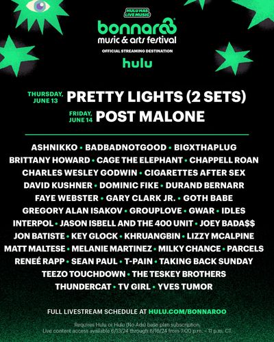 Sound Off returned to The Farm in June 2024 for another year of bringing Bonnaroo Music & Arts Festival to Hulu through two curated channels, each packed with good vibes and good music. Creating two curated schedules with four stages of performances and host segments is similar to putting together a puzzle. Some acts must be broadcast live, others allow only a partial set, and of course we can't forget about maintaining continuity with time of day! The final two channels collectively showcased 46 acts, including Post Malone, Pretty Lights, GWAR, T-Pain, Reneé Rapp, Chappell Roan, Melanie Martinez, Jon Batiste, Khruangbin, Jason Isbell and the 400 Unit and so many more.